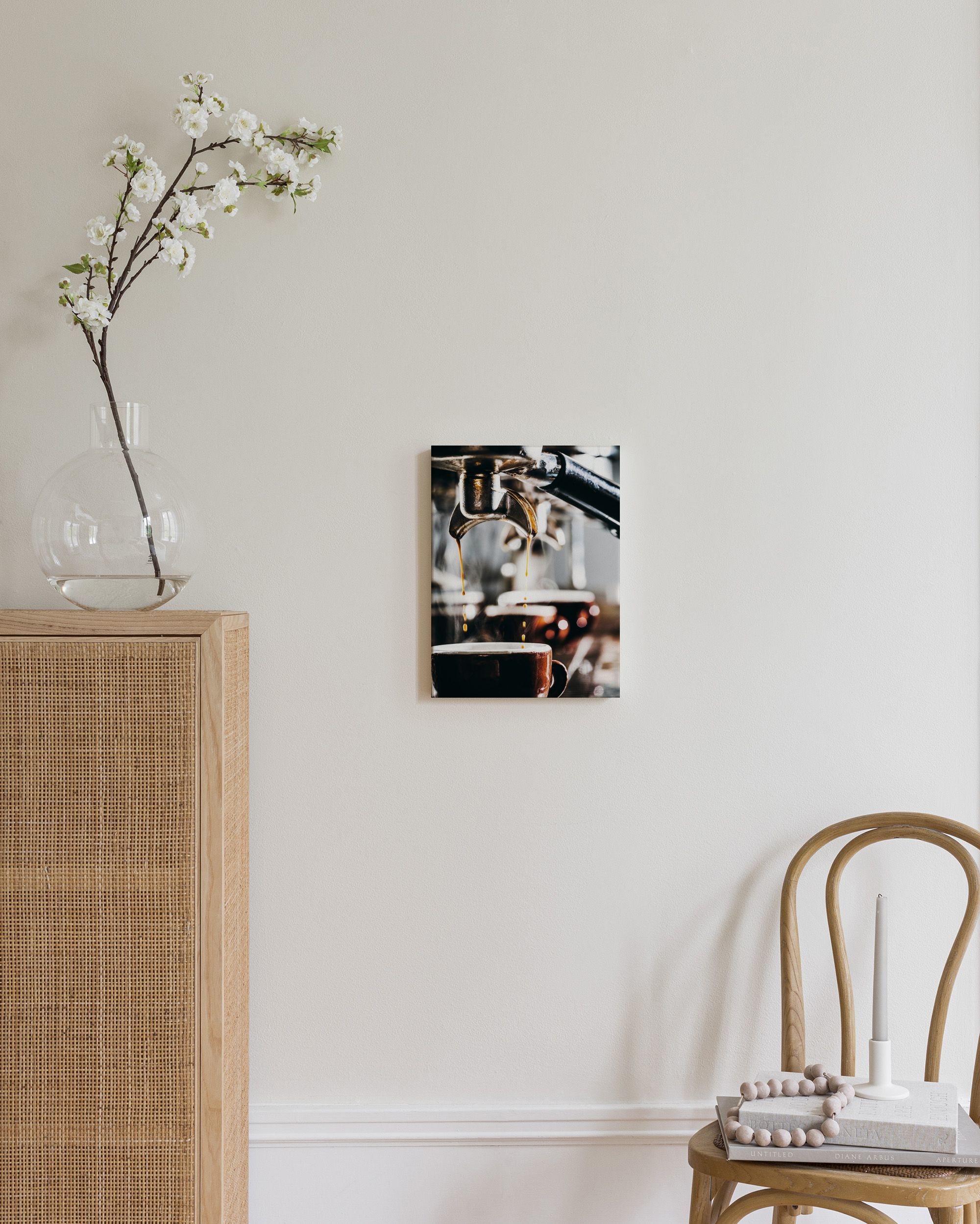 Een warme en uitnodigende canvas die espresso toont die uit een machine in een kopje wordt gegoten, met opstijgende stoom.