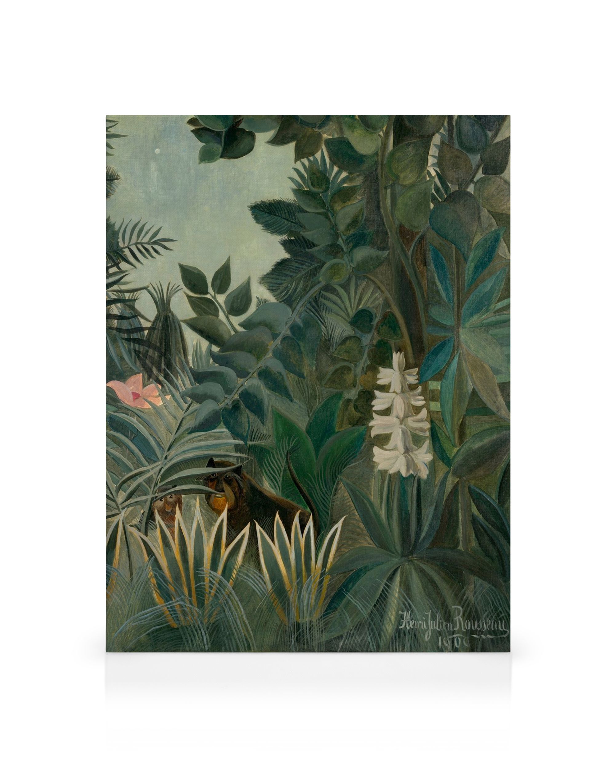 Vanaf € 9,07Een prachtige canvas van Henri Rousseau's weelderige jungle schilderij in tinten groen. Deze muurdecoratie bevat dichte bladeren met witte bloemen en roze accenten, perfect voor het creëren van een tropische galeriewand in jouw huis.