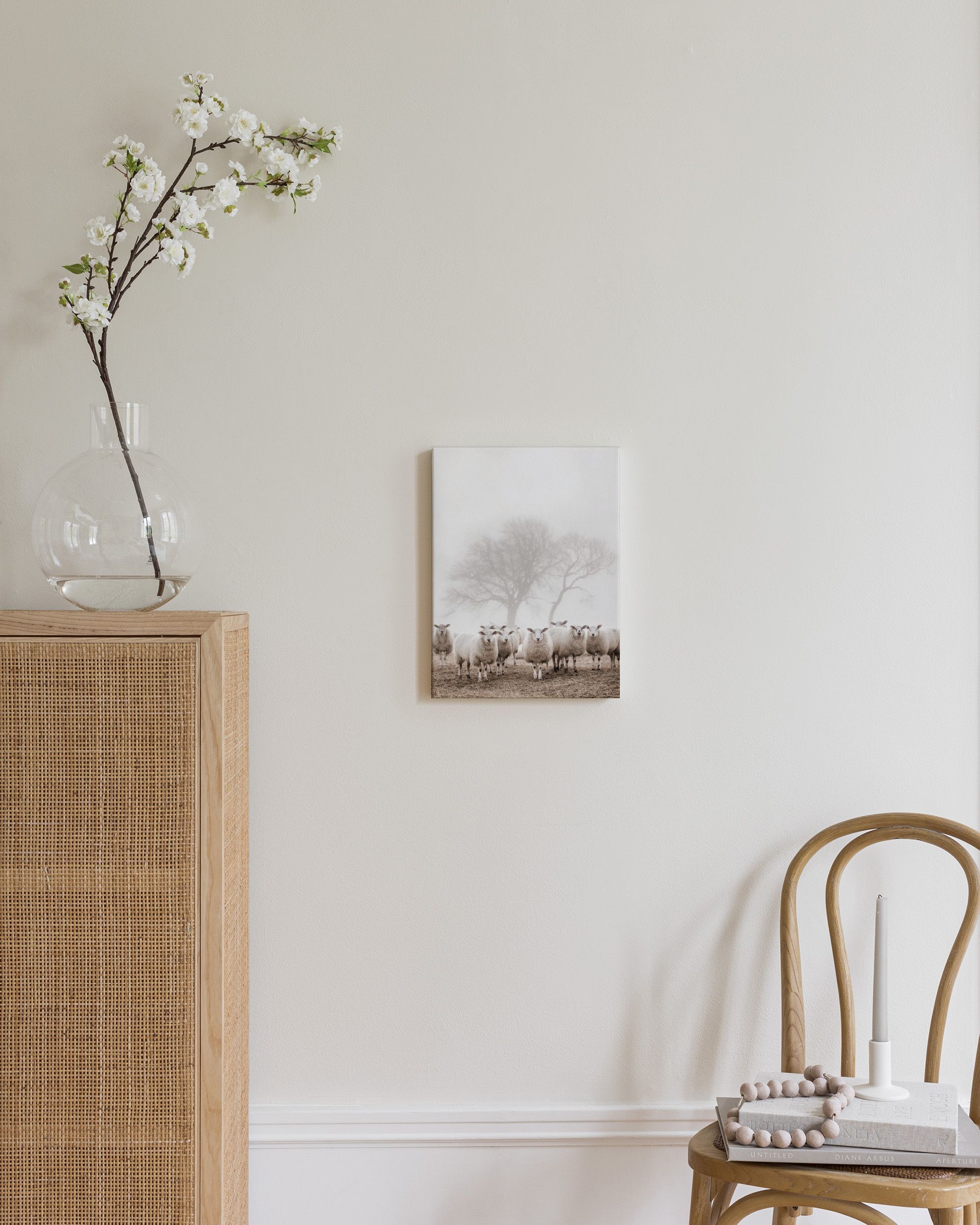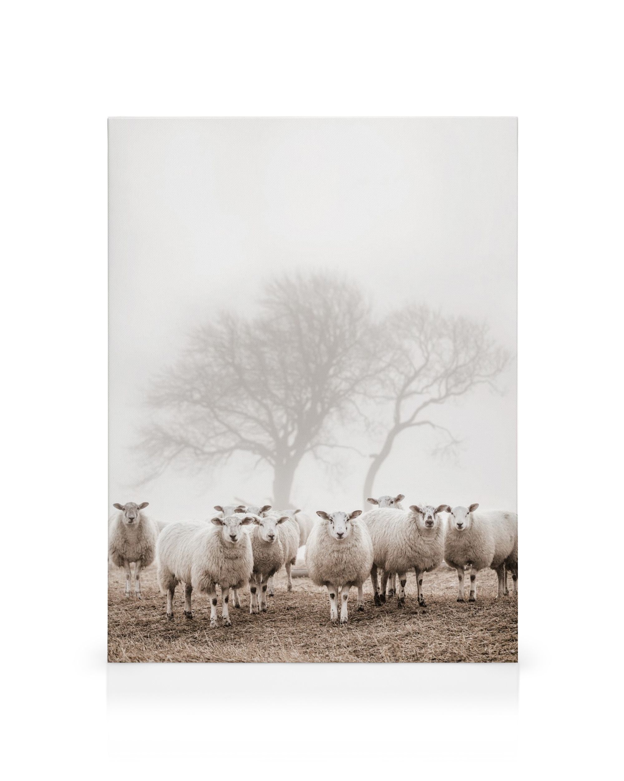 Een mooie poster van schapen die op droog gras staan. Hun wol is wit en zacht. De achtergrond is mistig in beige en bruine tinten voor een rustige sfeer.