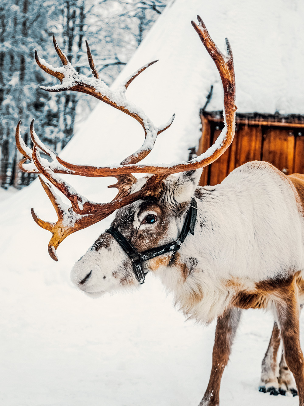 Een prachtige poster van een rendier met grote geweien in de sneeuw. Het rendier heeft wit en bruin bont en draagt een zwart tuig. Perfect voor een winterse sfeer in huis.