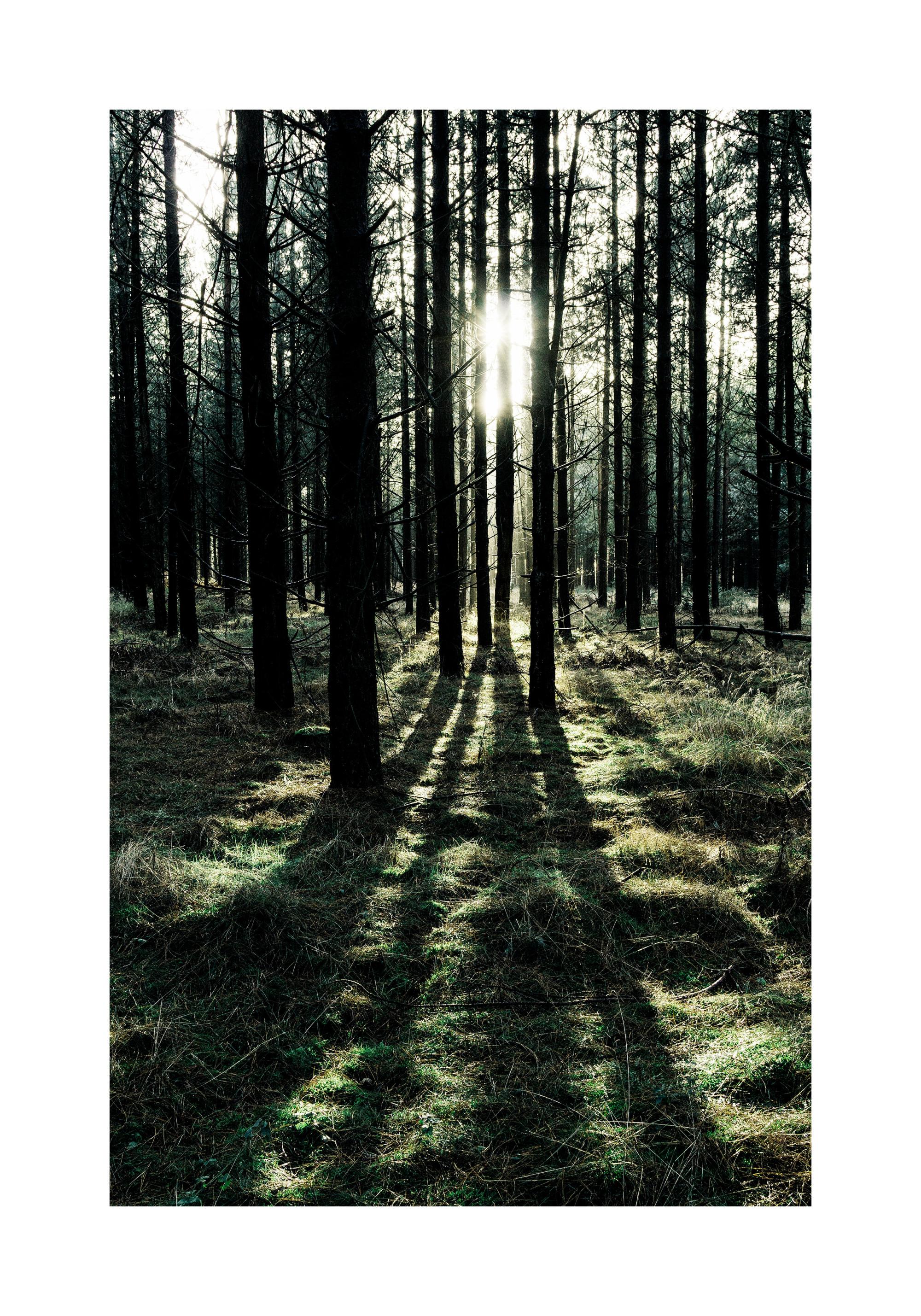 Prachtige natuurposter met een schitterend motief van een dun dennenbos in diepgroene tinten. Door de smalle ruimte tussen de hoge bomen dringt het zonlicht door en vormt het prachtige schaduwen tegen het mos op de grond. Het motief heeft een ingebouwde passe-partout die de afbeelding op een stijlvolle manier omlijst.